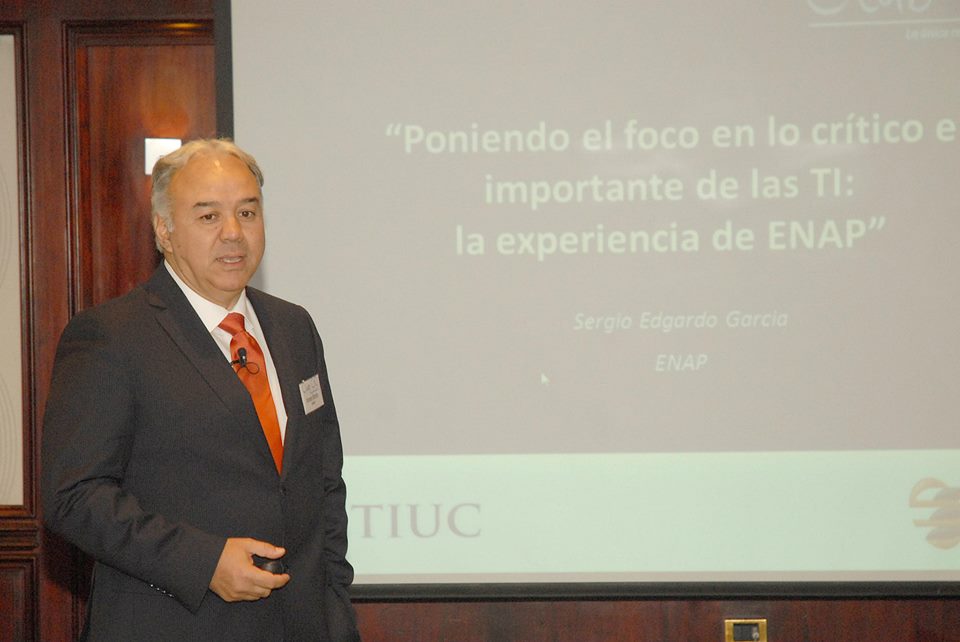 La presentación de Sergio García trató sobre cómo poner el foco en lo crítico e importante en las TI, basándose en la experiencia satisfactoria que tuvo la Empresa Nacional del Petróleo. Una de las iniciativas habilitadoras de este transformación fue “caminar el proceso” de la organización, es decir, observar los distintos procesos realizando juicios sobre de qué manera el área de TI podía aportar en cada uno de ellos. Este esfuerzo por entender el negocio mediante un diagnóstico fue clave para entender los puntos críticos donde se podía aportar con tecnologías, haciendo foco en las distintas dimensiones.