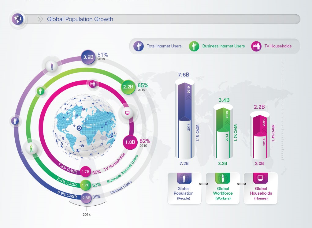 - Más usuarios de internet – Con el crecimiento y expansión de las redes fijas y móviles, más personas tendrán acceso a Internet y redes. En 2014, había 2800 millones de usuarios de Internet lo que equivale al 39% de la población mundial que es de 7,2 mil millones. En 2019, habrá alrededor de 3.900 millones de usuarios de Internet, es decir, el 51% de la población mundial proyectada (7.600 millones). (Fuente:Departamento de Asuntos Económicos y Sociales de las Naciones Unidas).