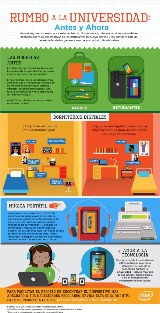 · Un vistazo hacia atrás: Mirando hacia atrás y recordando cómo era la vida universitaria cuando nuestros padres eran estudiantes en la década de los 60´s – 70´s, muestra cuanto han cambiado los tiempos. Los padres solían cargar cuadernos, carpetas, estuches de lápices y una tarjeta para la biblioteca en su mochila, como también su dispositivo de alta tecnología de aquellos tiempos: una calculadora. Hoy, la tecnología juega un papel crucial para la vida estudiantil de los universitarios, con teléfonos inteligentes, laptos y tablets encabezando la lista.