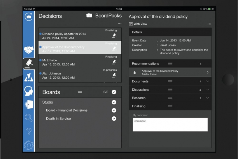 Boardpack permite a los asistentes a la reunión, el acceso a la totalidad de datos, como por ejemplo: políticas empresariales, normativas, estados financieros mensuales y/o anuales, etc, lo que contribuye a la toma de decisiones, no sólo en el transcurso de la reunión, si no que otorga la opción de chequear los datos en totalidad durante 24 horas, todo esto, desde dispositivos móviles.