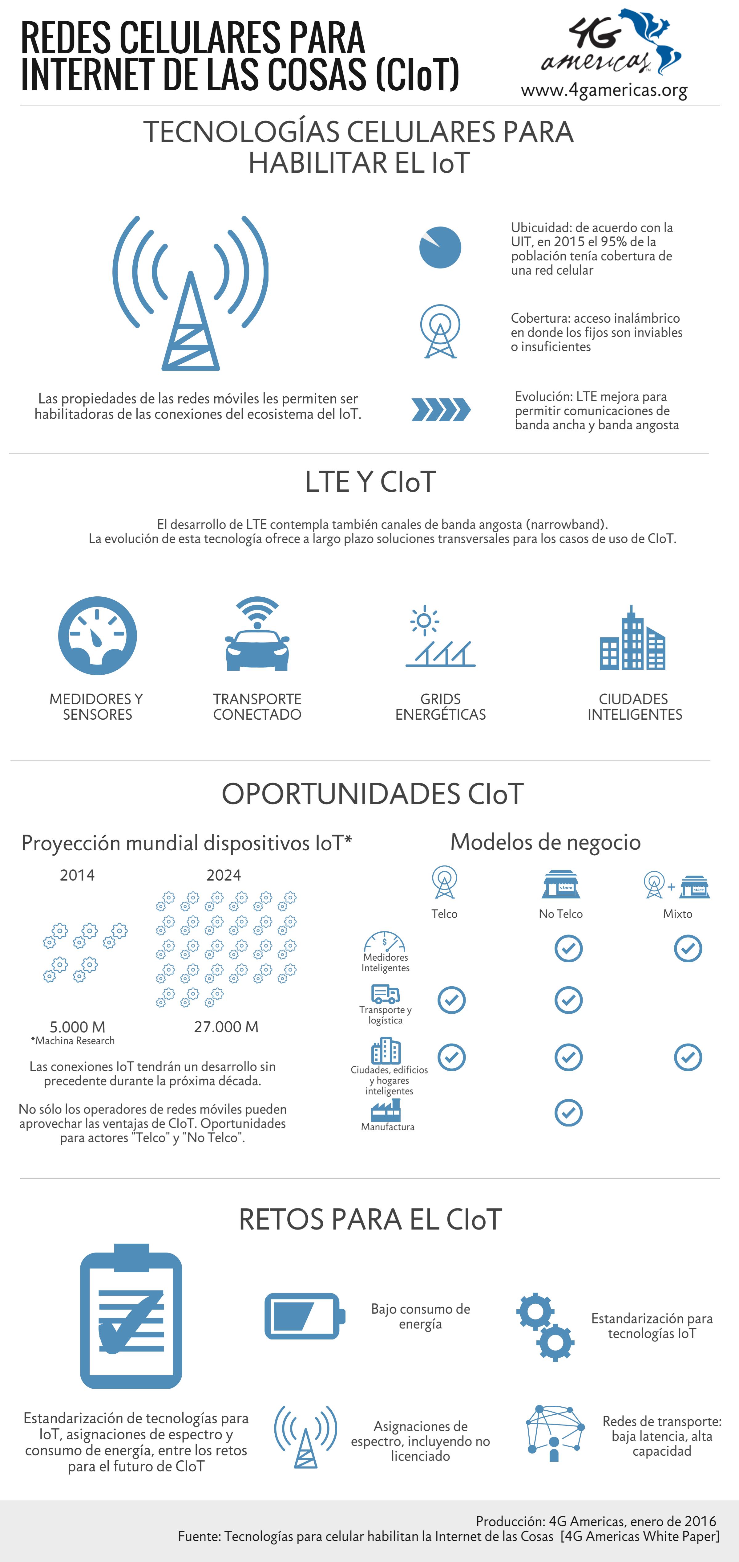 19 de enero de 2016 – Las propiedades actuales y su desarrollo a futuro permiten a las redes móviles ser habilitadoras del ecosistema de la Internet de las Cosas (IoT). En su White Paper Cellular Technologies Enabling the Internet of Things (Tecnologías celulares habilitan el Internet de las Cosas), 4G Americas expone las ventajas de estas redes para un entorno IoT con más de 20.000 millones de conexiones.