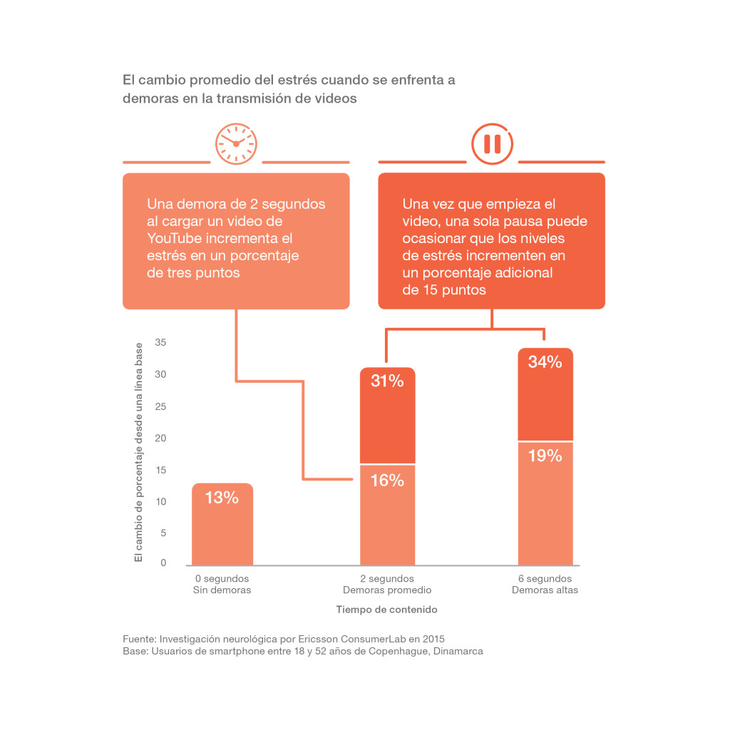 Para medir de manera objetiva las respuestas emocionales ante diferentes experiencias con smartphones se utilizó la neurotecnología. Las demoras o retrasos en cargar videos y páginas web bajo presión de tiempo, causaron que usuarios de móviles incrementarán su ritmo cardíaco en un promedio de 38%. Seis segundos de demora en la transmisión de video ocasionó niveles de estrés que se incrementaron en un tercio. Para contextualizar lo mencionado anteriormente, el estrés en el que se incurre equivale a la ansiedad que se genera al rendir un examen matemático o ver solo una película de terror, e incluso mayor que el nivel de estrés experimentado al estar parado al borde de un acantilado virtual. Una vez que el video empieza, una pausa adicional puede ocasionar que los niveles de estrés incrementen de manera dramática.