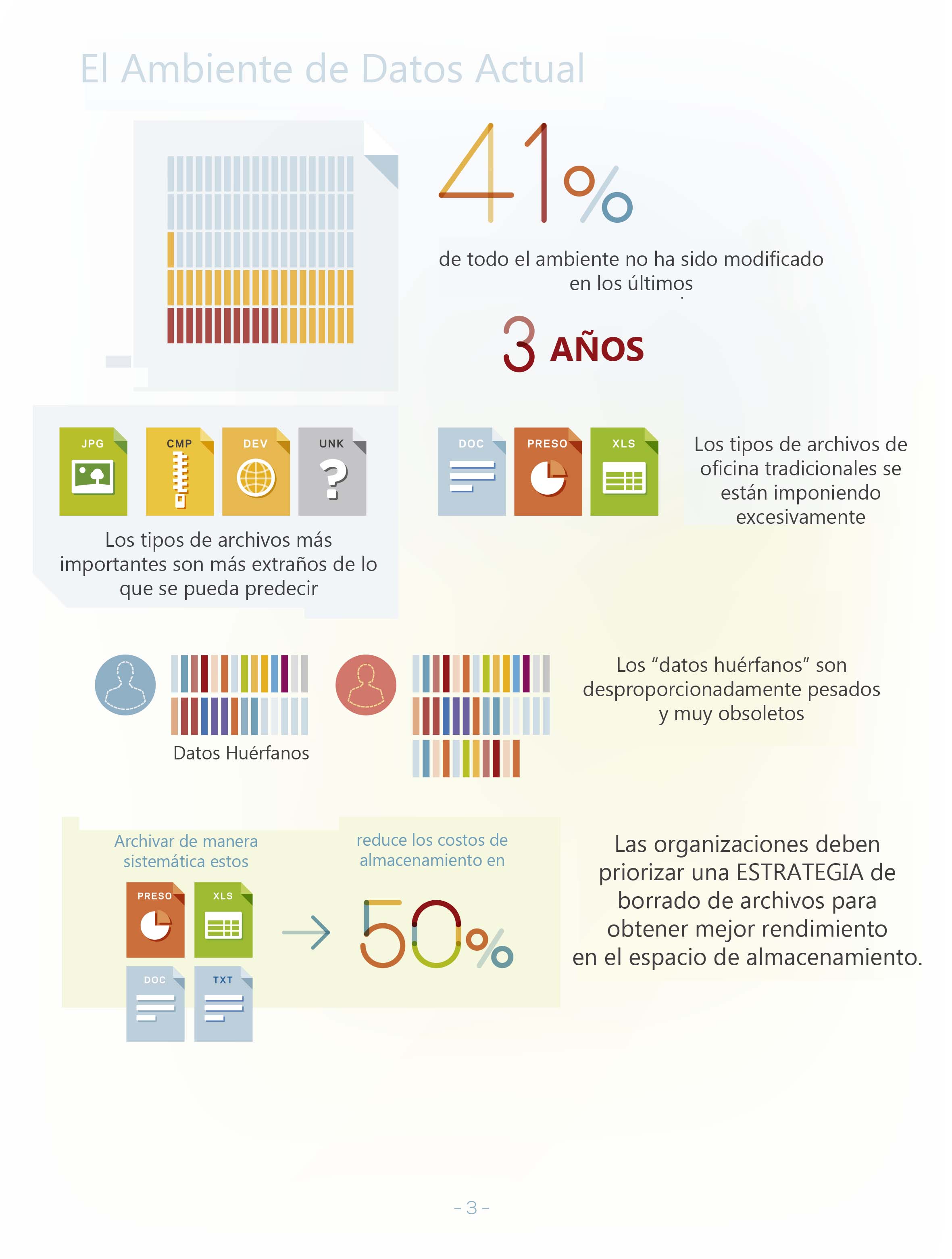 Con la excepción de requerimientos regulatorios y de cumplimientos de preceptos legales, el periodo para que los datos se vuelvan caducos es de tres años. Increíblemente, 41% de los datos dentro del entorno ya es estático o no ha sido modificado en 3 años.