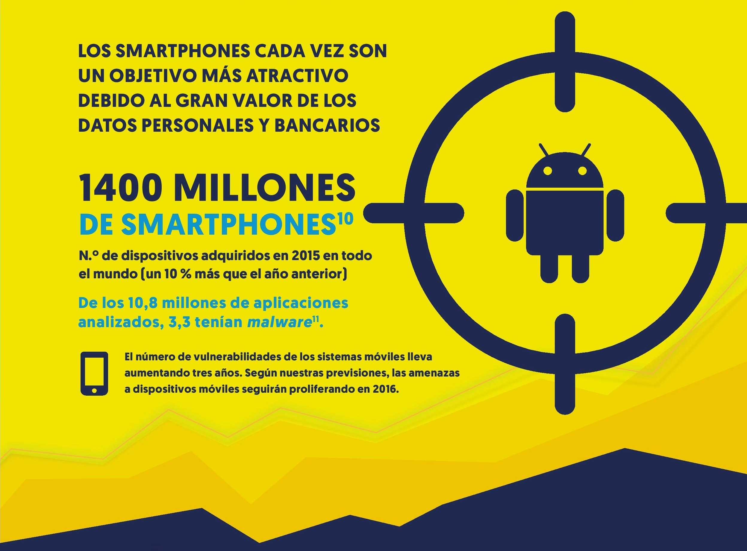 El número de smartphones que salen y se venden en el mercado año a año no para de crecer. Durante el 2015 se adquirieron 1400 millones de smartphones, un 10% más que el 2014. De los 10,8 millones de aplicaciones analizadas, 3,3 millones tenían un malware según el estudio de Symantec, Internet Security Threat Report.