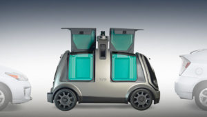 Poniendo los ojos en este escenario, es que Nuro está tomando un enfoque diferente. Sus ingenieros han construido algo completamente nuevo, han partido de cero. En lugar de acondicionar un crossover Lexus o un Ford Focus en hardware de conducción automática y cargar en ellos posibles entregas, este móvil parece una lonchera gigante sobre ruedas. Este prototipo R1 de Nuro (solo un apodo interno y no el nombre oficial) parece una lonchera gigante sobre ruedas. De hecho se parece más a los modelos originales del «Firefly», que fue el primer vehículo de “Nuro” que Google retiró oficialmente el verano pasado.