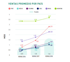 En relación a las ventas, el estudio determinó que las compañías argentinas son las líderes de la región con una facturación promedio con US$ 3,67 millones en 2018, seguidas por ventas de US$ 2,79 millones de las peruanas que incrementaron su facturación respecto de 2017 (US$ 1,45 millones). Las brasileras y colombianas se ubicaron en el tercer y el cuatro lugares (US$ 2,28 millones y US$ 1,19 millones, respectivamente) en el presente año.
