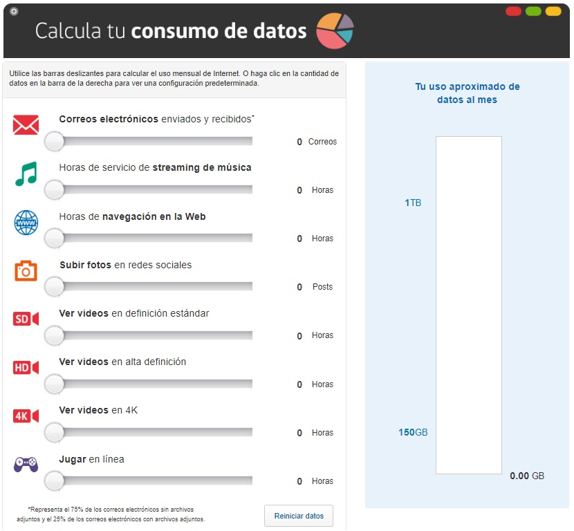 Para evaluar las proporciones, el sitio cuenta con una tabla que estima los datos en cada actividad. Un correo electrónico sin datos adjuntos equivale a 20 kilobytes, una canción descargada a 40 megabytes y dos minutos de streaming en alta resolución a 83,4 megas, aproximadamente.