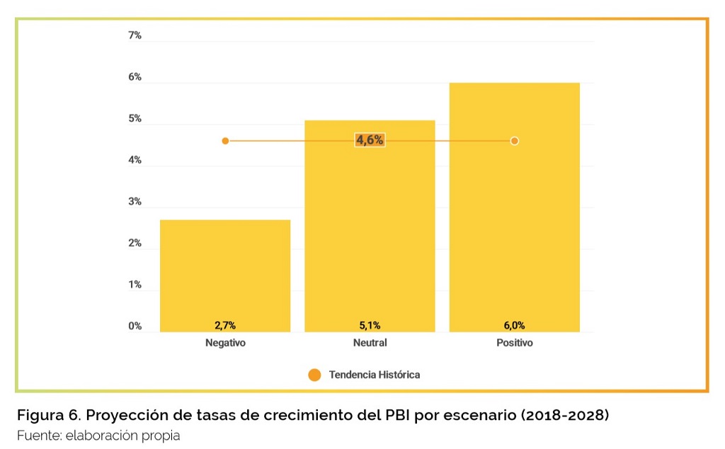 El ejercicio incluye también escenarios menos optimistas para el país: un escenario “negativo”, que refleja un deterioro respecto de la adopción histórica de tecnología que llevaría a Chile a una desaceleración del crecimiento (2.7%). Y un escenario “neutral” o de “statu-quo” que asume que la economía chilena mantiene el mismo ritmo de adopción tecnológica que tuvo en los 90s; en este caso, su proyección de crecimiento se mantiene en el 5.1%.
