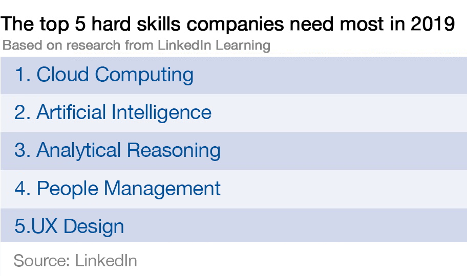 En el lado duro, la computación en la nube fue superior, con ingenieros en demanda a medida que más y más servicios y datos migran a la nube. La inteligencia artificial vino a continuación, seguida de un razonamiento analítico, ya que las empresas necesitan tomar decisiones basadas en la gran cantidad de datos a los que ahora pueden acceder. La gestión de personas ocupó el cuarto lugar, seguida del diseño de la experiencia del usuario, el proceso de hacer que todas estas nuevas tecnologías sean accesibles y fáciles para que los humanos interactúen.