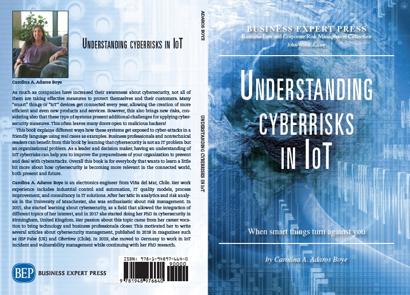 La chilena Carolina Adaros está estrenando por estos días su primer libro, «Understanding CyberRisks in IOT», en donde explica las diferentes maneras en que estos sistemas se exponen a los ataques cibernéticos en un lenguaje amigable utilizando casos reales como ejemplos, permitiendo a sus lectores aprender un poco más sobre cómo la ciberseguridad es cada vez más relevante en el mundo conectado, tanto presente como futuro.