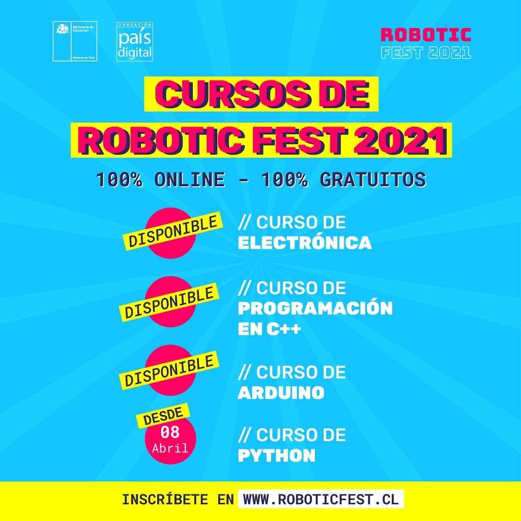 Robotic Fest cuenta con diversos cursos en su página web, www.roboticfest.cl que estarán disponibles durante todo el primer semestre de 2021 y que buscan que los estudiantes entre séptimo y cuarto medio, puedan encontrar un espacio de conocimiento, acercándose a personas con sus mismos intereses y descubriendo en conjunto más sobre el mundo de la robótica educativa.