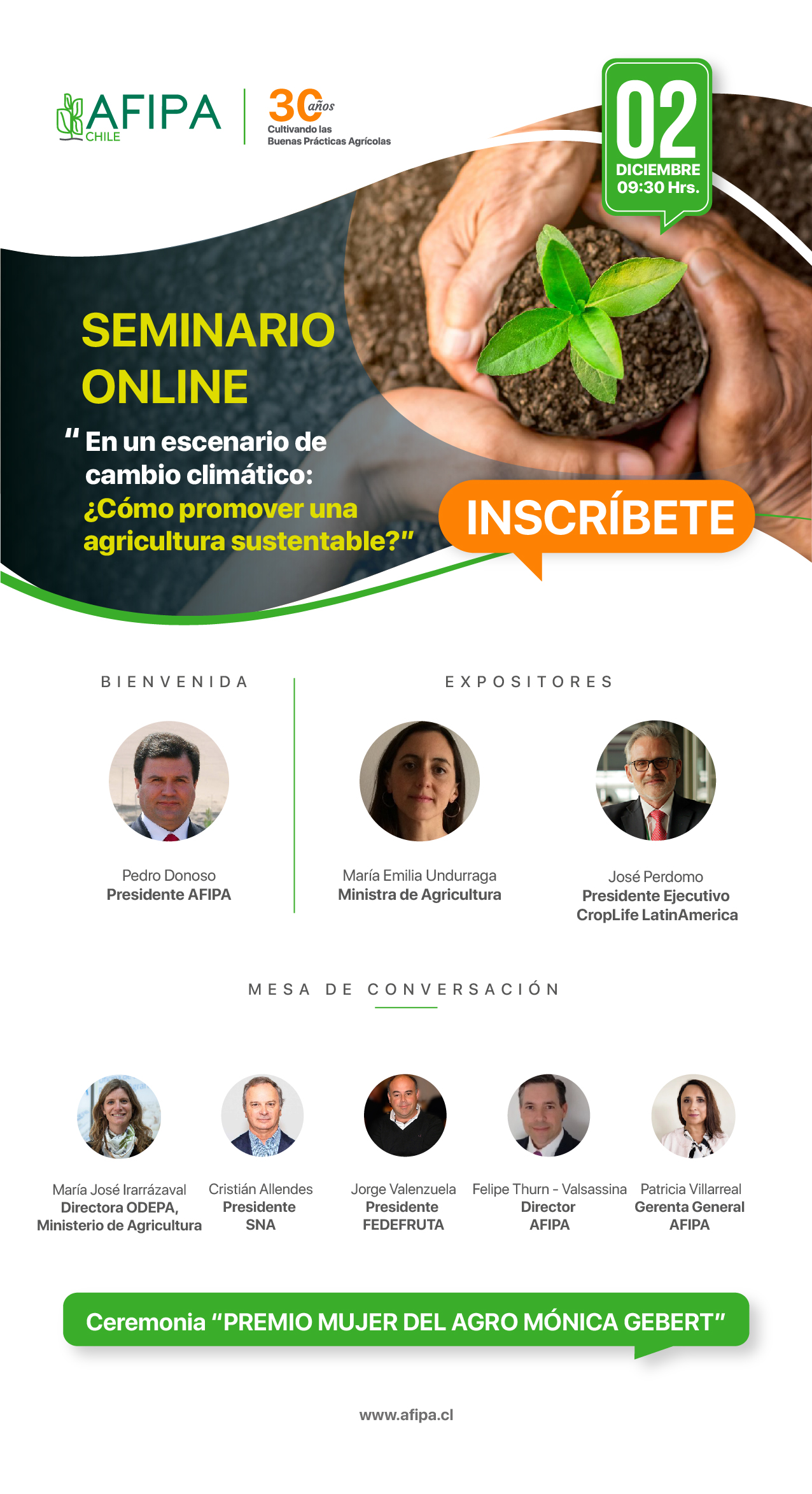 Santiago, 01 de diciembre de 2021.- Como parte de las actividades con que conmemora sus 30 años de presencia en Chile representando a la industria de la protección de los cultivos y fomentando las buenas prácticas agrícolas, la Asociación Nacional de Fabricantes e Importadores de Productos Fitosanitarios Agrícolas (AFIPA A.G.) ha querido premiar y visibilizar a las mujeres que se han destacado por su liderazgo e innovación en post del desarrollo sustentable de la producción agroalimentaria a través del «Premio a la Mujer del Agro Mónica Gebert”