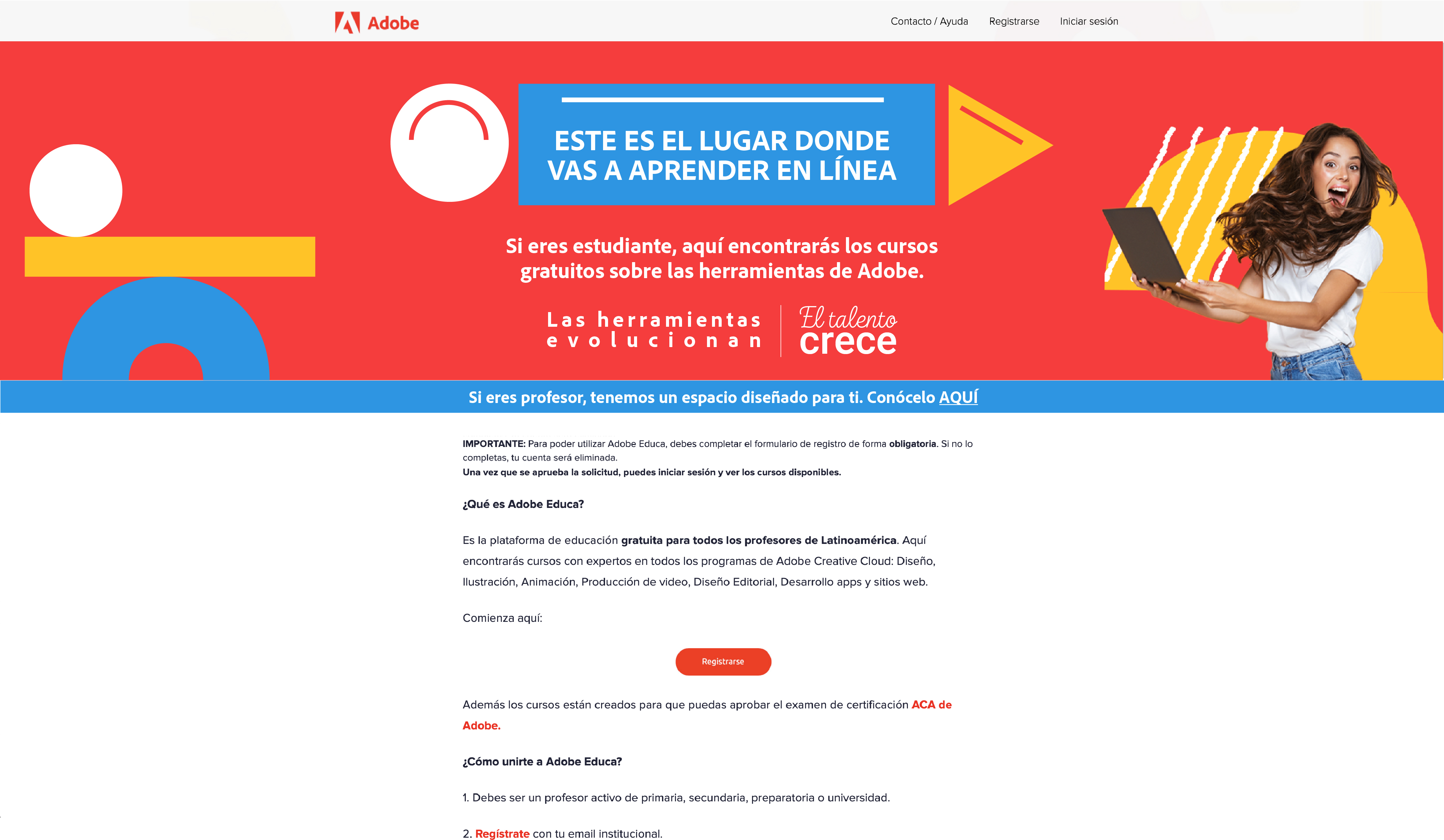 La plataforma creada con el propósito de brindar educación gratuita dirigida a todos los profesores de Latinoamérica de cualquier área, ofrece cursos y especializaciones para aprender a utilizar o mejorar las habilidades en los programas de Adobe Creative Cloud, sin importar el nivel de experiencia en el manejo de los mismos. Así mismo, ayuda en la planificación de esos cursos ya que encuentran guías de contenido para que lo puedan compartir con sus alumnos, incluso hay evaluaciones que funcionan como medición de aprendizaje.