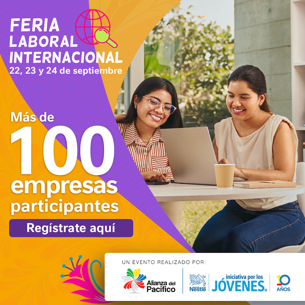 Latam, 04 de septiembre de 2023.- Entre el 22 y el 24 de septiembre se realizará de manera online la Feria Laboral más grande de Latinoamérica, con más de 100 empresas aliadas y que espera convocar a cerca de 220 mil jóvenes de la región, convirtiéndose en la antesala del VIII Encuentro por los Jóvenes de la Alianza del Pacífico, evento organizado anualmente por Nestlé para promover la empleabilidad juvenil.