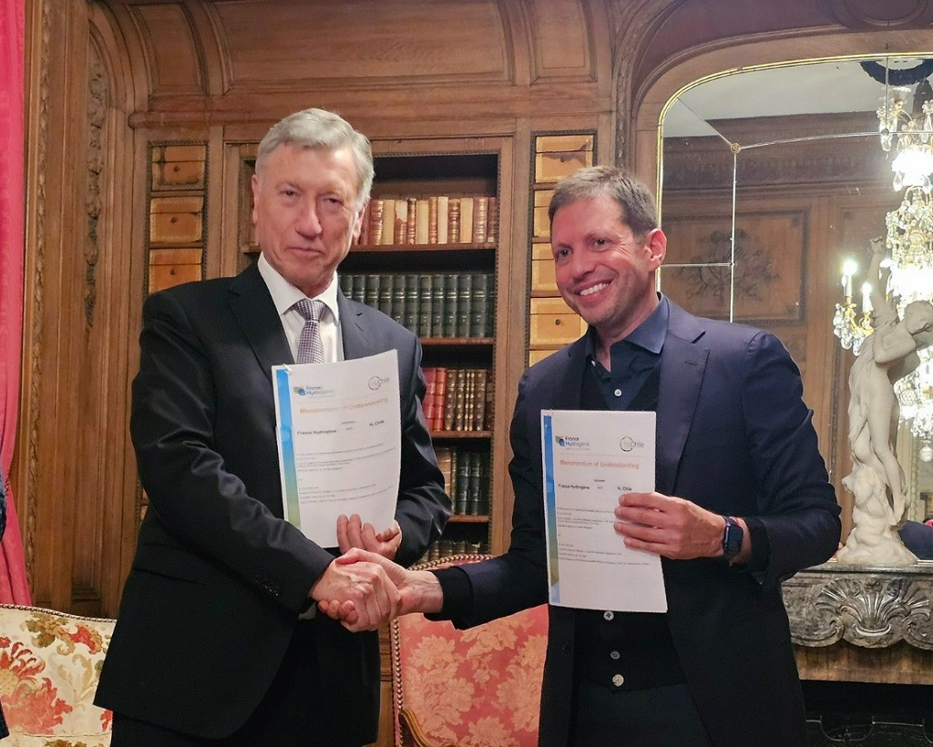 Santiago, 2 de febrero del 2024 – Philippe Boucly, Presidente de France Hydrogène, y Marcos Kulka, Director Ejecutivo de H2 Chile, firmaron un Memorando de Entendimiento (MoU) en el marco de la feria comercial Hyvolution Paris en la Embajada chilena. Este memorando tiene como objetivo fomentar la colaboración y cooperación entre ambas asociaciones de hidrógeno para acelerar el desarrollo de la economía del hidrógeno en Francia y Chile. Esta alianza reunirá las capacidades y conocimientos de ambas organizaciones en beneficio de sus respectivos ecosistemas de hidrógeno.