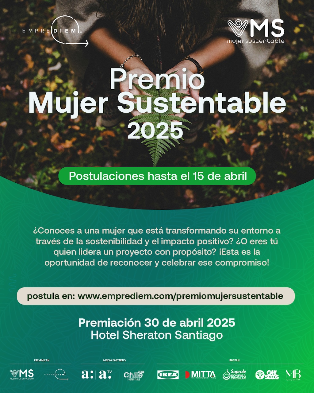 “El “Premio Mujer Sustentable” en su edición 2025 no solo es un reconocimiento, sino también un impulso para aquellas mujeres que están liderando el cambio y demostrando que la sostenibilidad es el camino que debe regir nuestro presente por un mejor futuro para todos. Queremos conocerlas, visibilizarlas e inspirar a más personas y demostrar que sí es posible construir un mundo mejor desde un liderazgo femenino que pone en el centro a la naturaleza y a las personas”, comenta Cata Droguett, destacada dentro de la lista de los 100 latinos más comprometidos por la acción climática.
