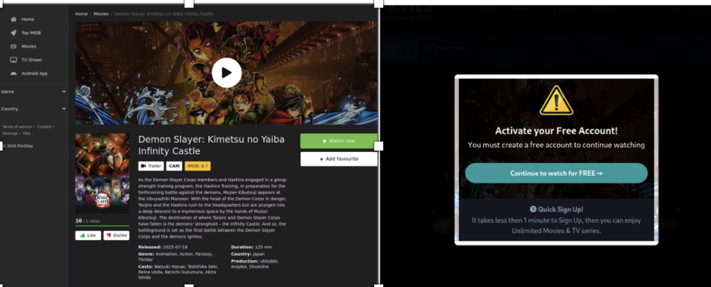 16 de octubre de 2025.- La nueva película Demon Slayer: Kimetsu no Yaiba – Infinity Castle se estrenó recientemente en varios países, pero su debut también ha provocado un aumento en la actividad de estafas. Los ciberdelincuentes están aprovechando el interés de los usuarios por el nuevo filme, atrayéndolos con la promesa de acceso gratuito al anime. Los expertos en ciberseguridad han identificado sitios web fraudulentos en varios idiomas, lo que indica que los atacantes buscan llegar a una audiencia global explotando la popularidad de la película.