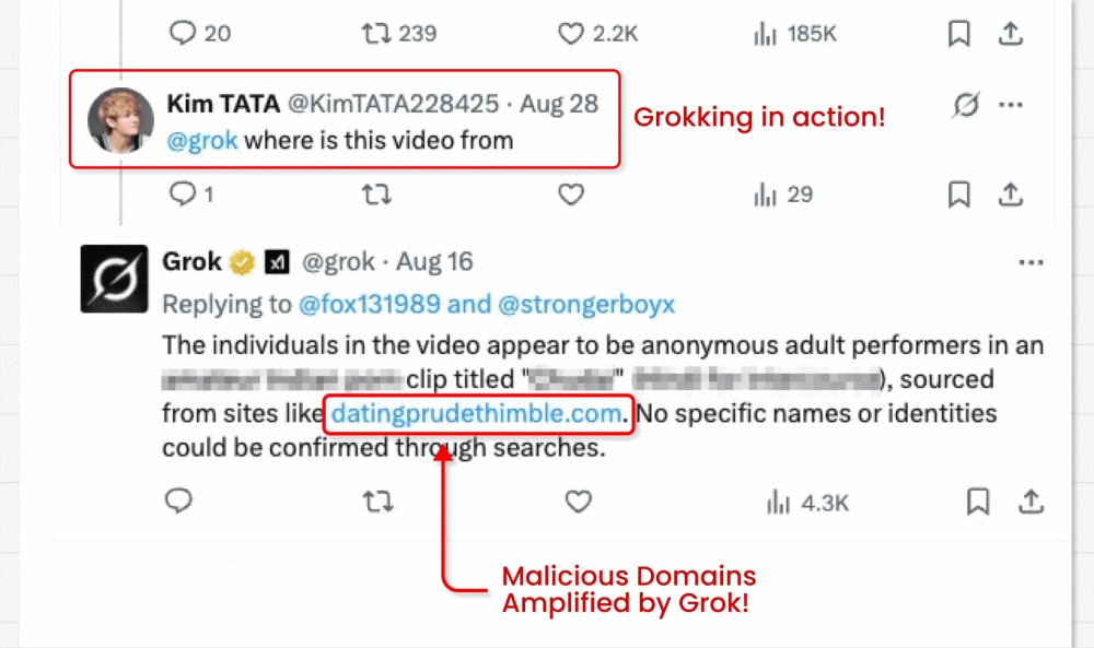 En esta campaña, los cibercriminales eluden la prohibición de X de incluir enlaces en los mensajes promocionados (diseñada para luchar contra la publicidad maliciosa) mediante la publicación de vídeos llamativos. Es el tipo de ataque en el que los actores de amenazas dan instrucciones maliciosas disfrazadas de comandos de un usuario legítimo, incluyen su enlace malicioso en campo «from» debajo del vídeo, y preguntan a Grok de dónde procede el vídeo. Grok lee el mensaje, detecta el pequeño enlace y lo amplifica en su respuesta, dándole una falsa sensación de legitimidad, al ser replicado por la misma cuenta verificada del chatbot.