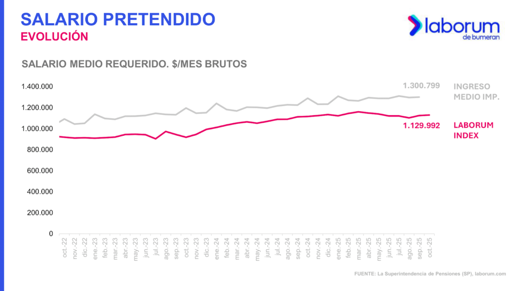 - Según el último Index del Mercado Laboral de Laborum, el salario pretendido promedio por los chilenos durante octubre fue de $1.129.992, lo que representa un aumento del 0,4%.