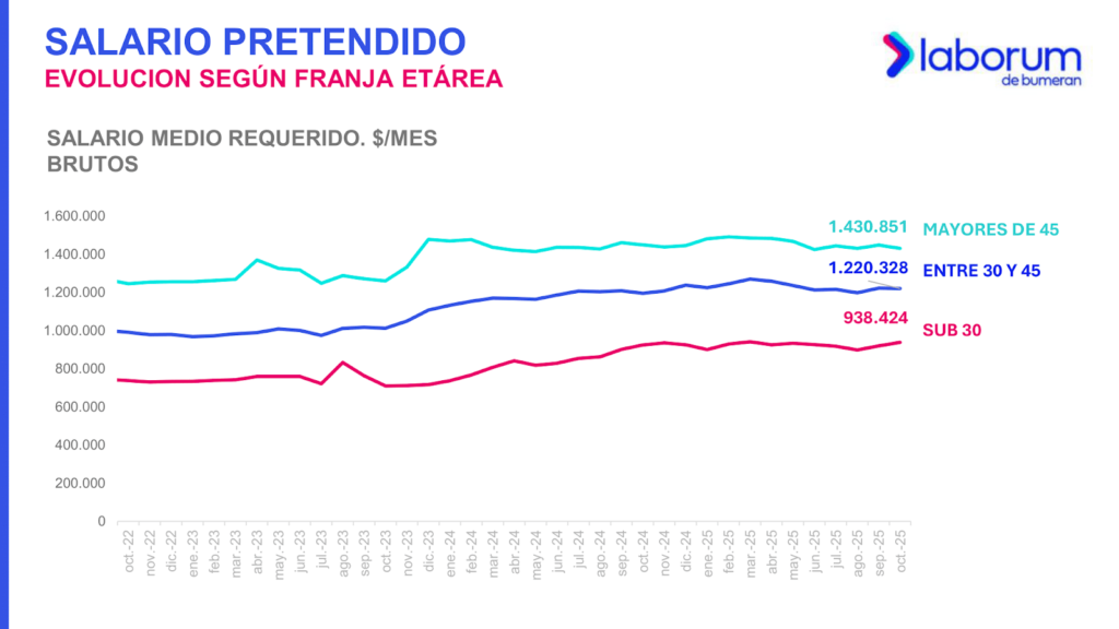 Para el segmento entre 30 y 45 años, el sueldo promedio requerido fue de $1.220.328, lo que representa una disminución del 0,2% en comparación al mes pasado. Por su parte, el segmento de talentos mayores a 45 años registró un salario promedio solicitado de $1.430.851, un 1,2% más que en septiembre.