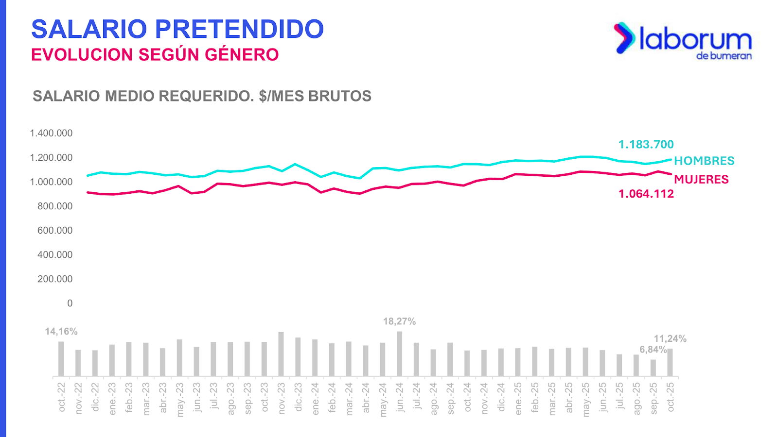 La brecha del salario requerido según género, aumentó por primera vez desde mayo de 2025, alcanzando una diferencia de 11,2%. En comparación con el mes de septiembre la brecha de género aumentó 4,4 puntos porcentuales. A nivel interanual, la brecha registra un incremento de 0,7 puntos porcentuales.