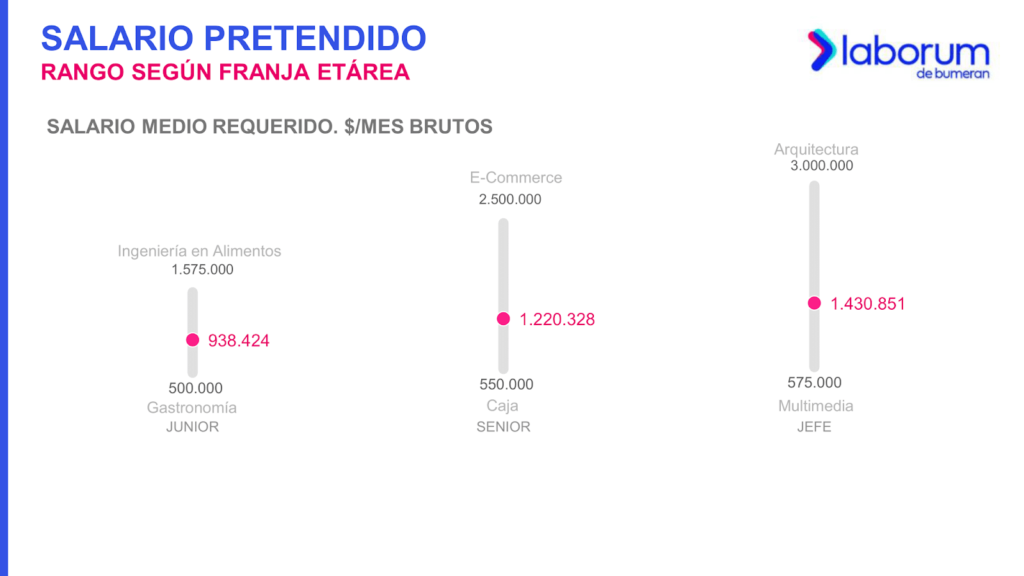 Las búsquedas de menores de 30 años para los puestos de Ingeniería en Alimentos son las postulaciones que reciben el requerimiento salarial más elevado, con $1.575.000, mientras que los cargos de Gastronomía son los que tienen la renta pretendida más baja con $500.000.