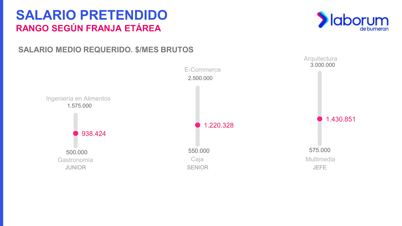 Finalmente, en el segmento de mayores de 45 años, Arquitectura es el puesto donde se requiere el mayor salario con $3.000.000. Por su parte, Multimedia, es el puesto con la pretensión salarial más baja, con $575.000.