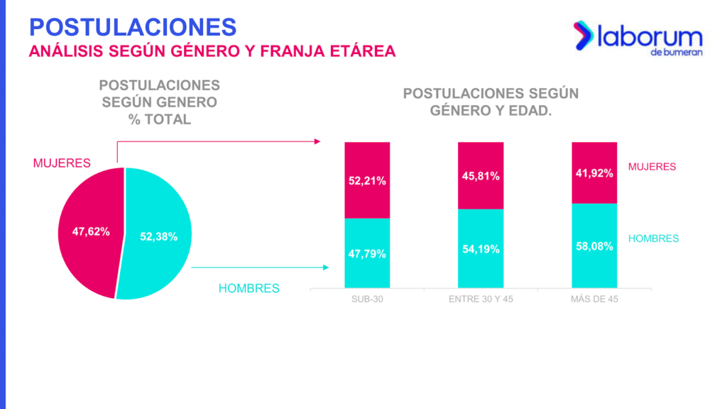 Al analizar los datos por segmento etario, el 52,1% de las postulaciones de personas menores a 30 años corresponden a mujeres. Sin embargo esta tendencia se revierte en el resto de los segmentos: entre los talentos de 30 a 45 años el 54,2% de los requerimientos son hombres; y en el segmento de mayores a 45 años el 58,1%.