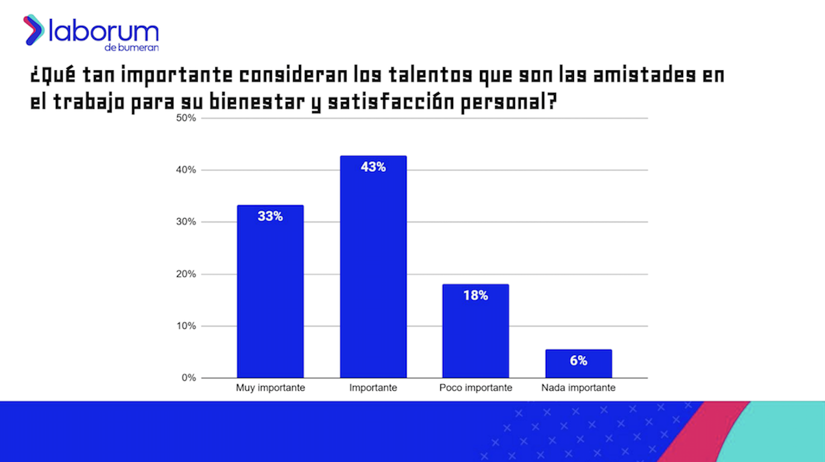 Work Partners, amigos para toda la vida es un estudio de Laborum en el que participaron 3307 personas trabajadoras y 465 especialistas en recursos humanos de Chile, Argentina, Ecuador, Panamá y Perú. La investigación explora el impacto que pueden tener las amistades laborales en el rendimiento y motivación de los talentos y la percepción de las organizaciones sobre ellas.