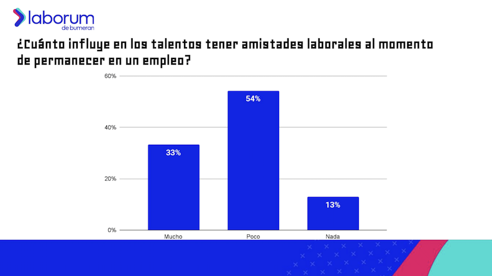 ¿Qué tanto influiría la presencia de amistades del trabajo en la decisión de los talentos de permanecer en un empleo? El 54% menciona que la presencia de amistades influiría poco en su decisión; el 33% dice que influiría mucho; y el 13% dice que nada.