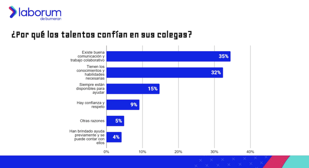 Sin embargo, al ser consultados por los motivos por los que no confían en sus compañeros, el 25% de los talentos afirma que se debe a que existe competencia o falta de colaboración; 21% sostiene que no hay un ambiente de confianza o respeto; el 18% explica que es porque tuvo malas experiencias en el pasado; otro 18% menciona otras razones; el 12% dice que es por falta de conocimiento o experiencia por parte de sus colegas; y el 6% manifiesta que sus compañeros no tienen la disposición para ayudar.