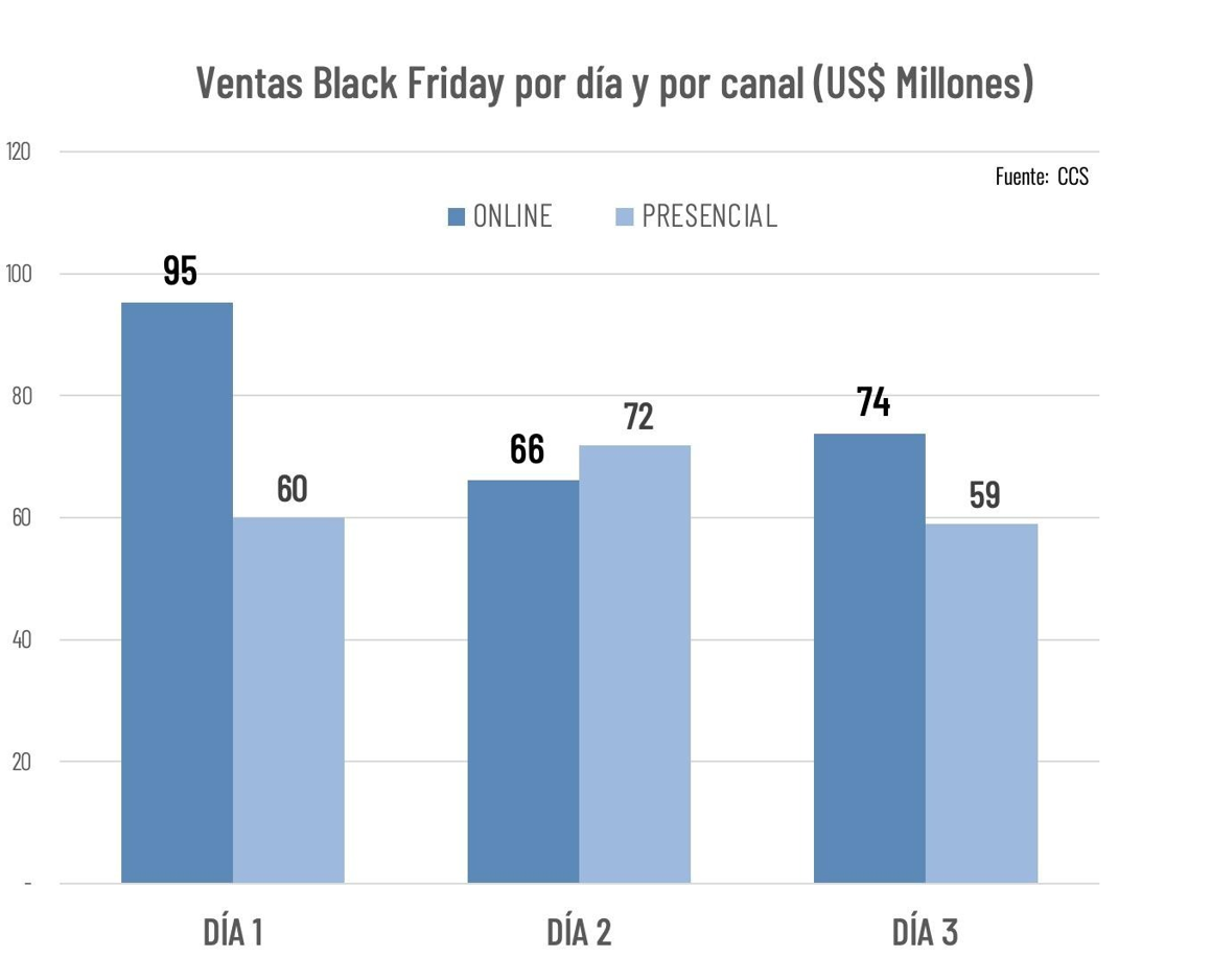 Chile, 02 de diciembre de 2025.- Las ventas del Black Friday 2025 organizado por la Cámara de Comercio de Santiago (CCS), sumaron US$ 426 millones al completarse las 3 primeras jornadas del evento, producto de más de 8 millones de transacciones (1 cada 2 habitantes), en el mismo período. Estas cifras representan un aumento del 4% en el número de transacciones y del 3% en los montos en relación a los mismos días del Black Friday 2024, levemente por encima de las expectativas de la organización.