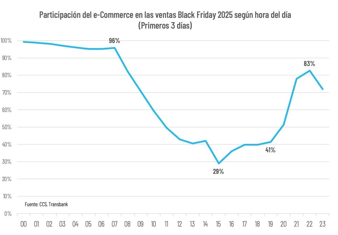 Durante cada jornada, en tanto, se observa una fuerte concentración de ventas online en horarios no hábiles, como es natural, mientras que el comercio físico obtiene sus mayores participaciones entre las 13:00 y 20:00 horas.
