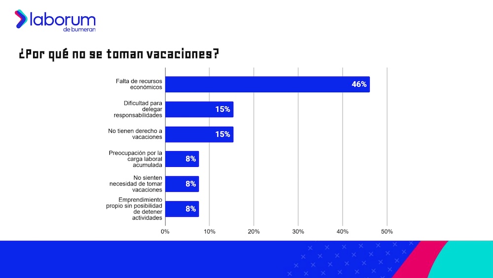 - Entre las principales razones por las que no salieron de vacaciones el 46% menciona la falta de recursos económicos y el 15% asegura que no puede delegar sus responsabilidades.