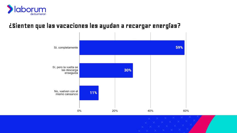 El descanso no solo es percibido como necesario, sino también como efectivo. El 59% de las personas trabajadoras en Chile asegura que las vacaciones les permiten recargar sus energías. Por otro lado, el 30% señala que si bien logran descansar, ese efecto positivo se diluye rápidamente al regresar al trabajo; y el 11% menciona que las vacaciones no los ayuda a recargar energía.