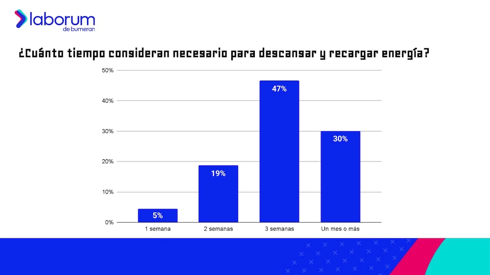 Para la mayoría de los talentos en Chile, el tiempo ideal de vacaciones supera ampliamente los períodos breves, el 47% de los talentos indica que necesitan 3 semanas de vacaciones para descansar correctamente; el 19% afirma que 2 semanas; y sólo el 5% cree que una semana es suficiente.