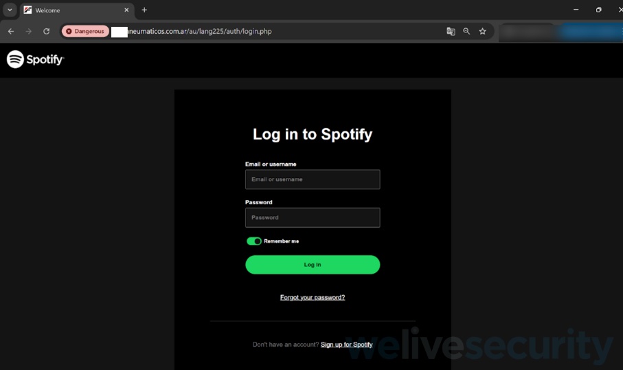 Empresa de neumáticos de Argentina: Otro ejemplo de esta práctica maliciosa involucra a la página web de una empresa argentina que vende neumáticos. En este caso, el sitio falso busca obtener las credenciales de acceso a Spotify de las víctimas.