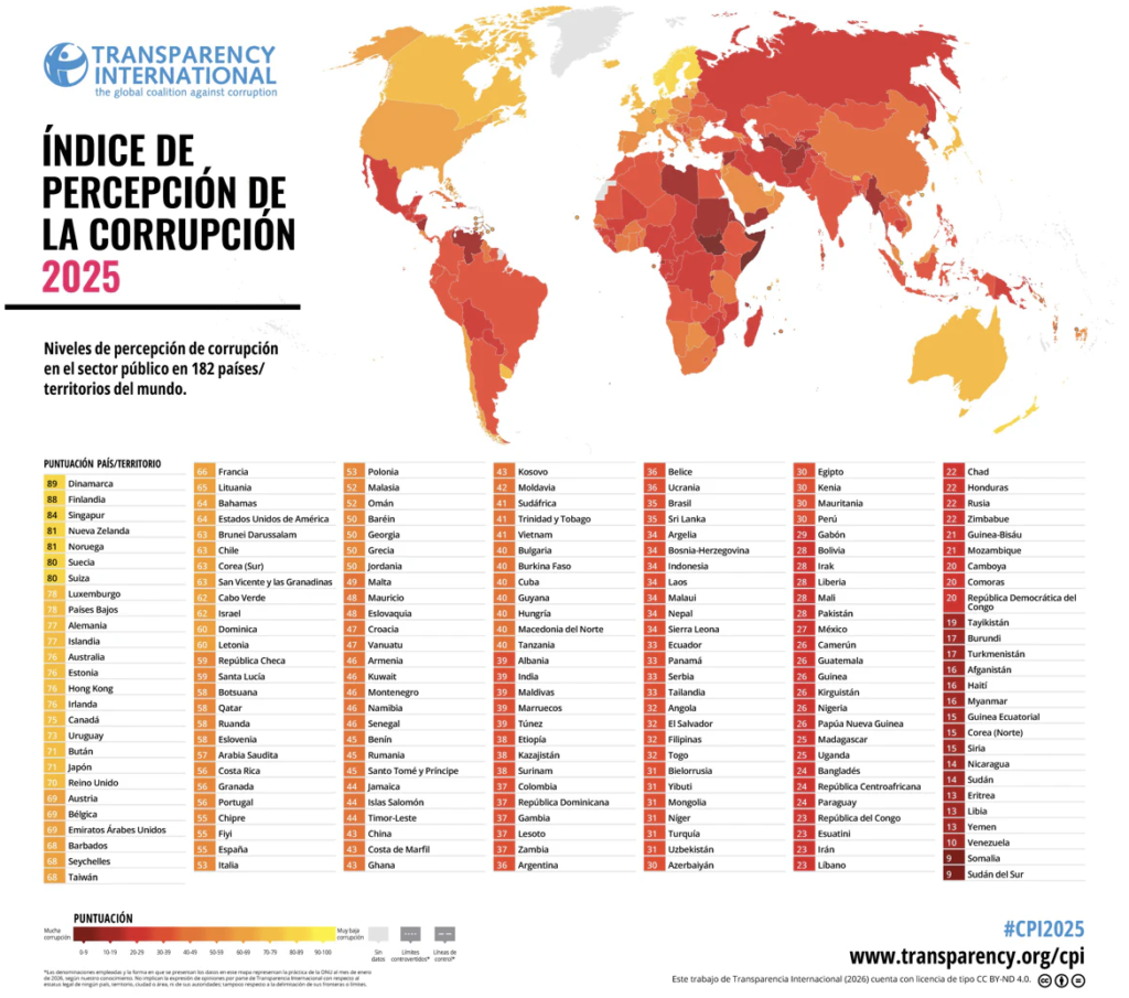 Chile, 12 de febrero de 2026. Transparency International, a través de su capítulo nacional Chile Transparente, presentó los resultados del Índice de Percepción de la Corrupción (IPC) 2025, estudio que evalúa la percepción de corrupción en el sector público de 182 países y territorios, utilizando una escala de 0 a 100 puntos, donde 100 representa el menor nivel de corrupción percibida.