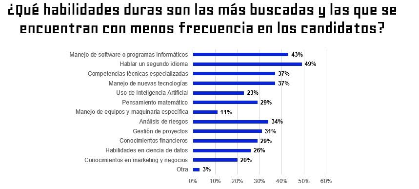 En lo que respecta a las habilidades duras o conocimientos técnicos, el 49% considera que lo más buscado es hablar un segundo idioma; el 43% destaca el manejo de software; y el 37% considera las competencias técnicas especializadas entre las habilidades más buscadas.