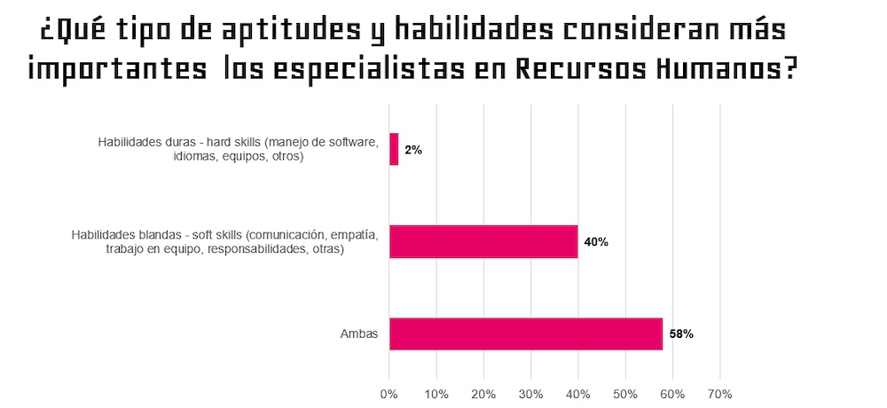 Además el 69% de los expertos considera que las habilidades blandas son las más solicitadas y las que se encuentran con menor frecuencia en los candidatos. Esta preferencia se replica en la región, con el 69% en Perú; el 68% en Argentina; el 62% en Ecuador; y el 57% en Panamá.