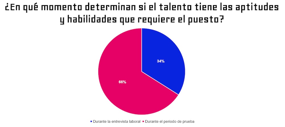 ¿En qué momento determinan los especialistas si el talento tiene las aptitudes y habilidades que requiere un puesto de trabajo? El 66% de los expertos sostiene que esto se observa durante el periodo de prueba; mientras que para el 34% se da durante la entrevista laboral.