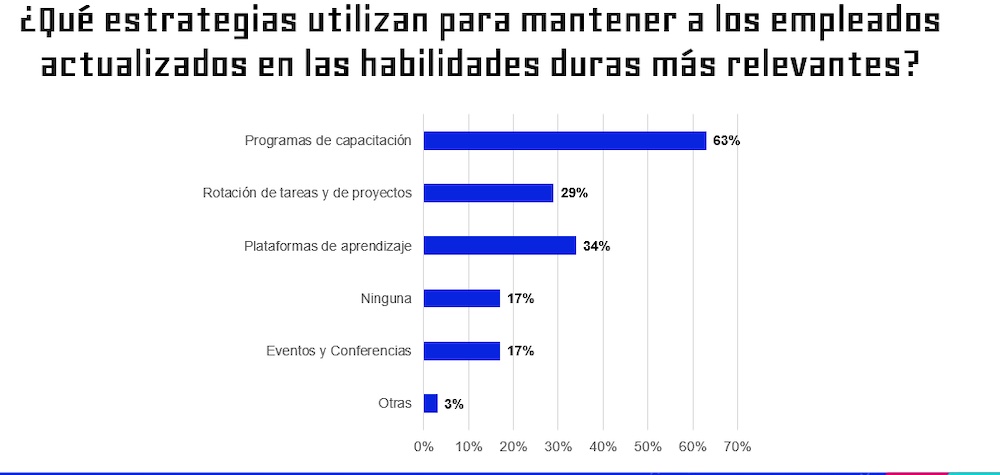 Si se trata de habilidades duras, el 63% opta por incorporar programas de capacitación;el 34% opta por plataformas de aprendizaje; y el 29%por rotación de tareas y proyectos.
